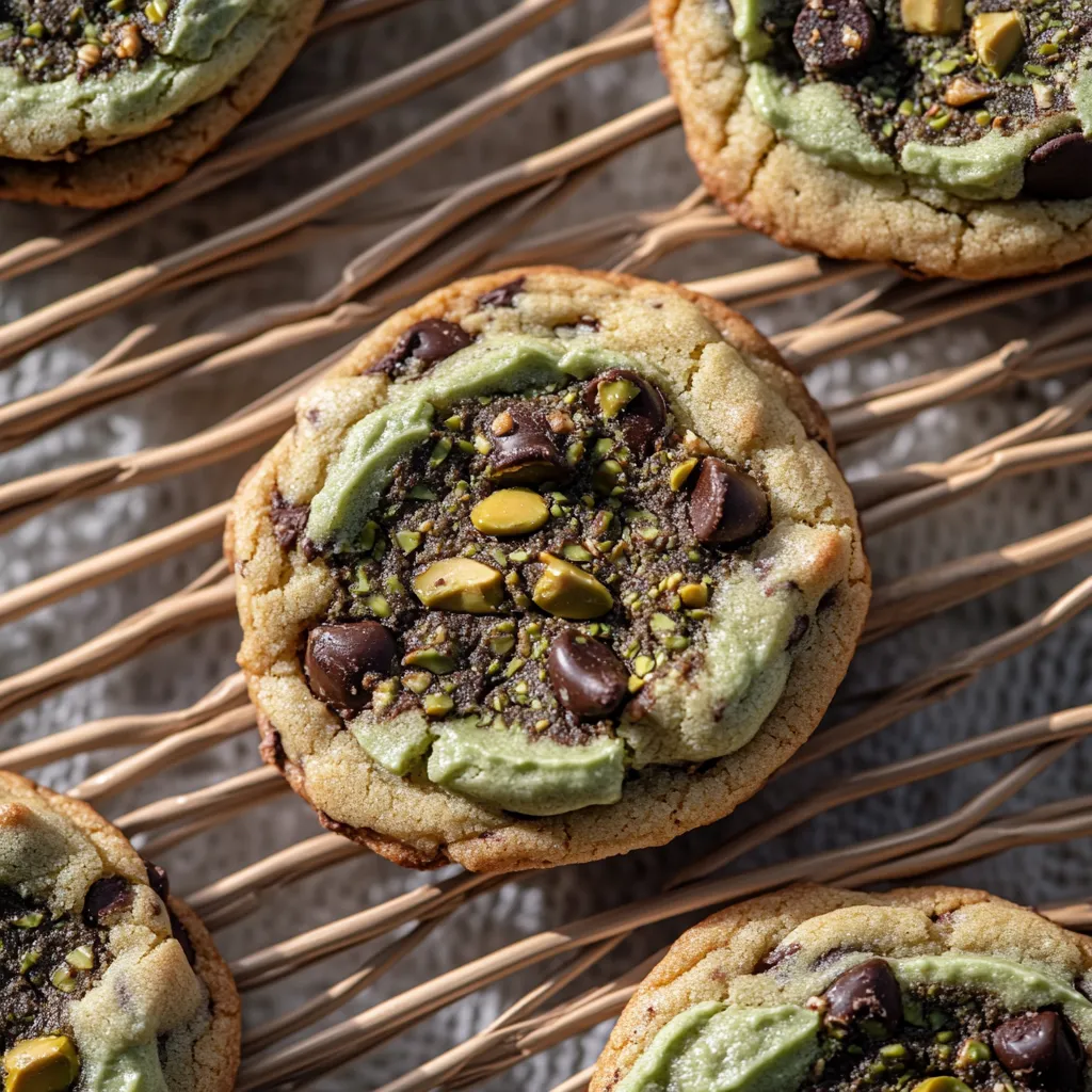 - Put your chilled dough balls on a parchment-lined baking sheet with space between them. If you want, top each with a tiny bit of melted pistachio cream. Bake at 350°F for 12-14 minutes until the edges turn golden but centers stay a bit soft. They'll firm up more after you take them out.